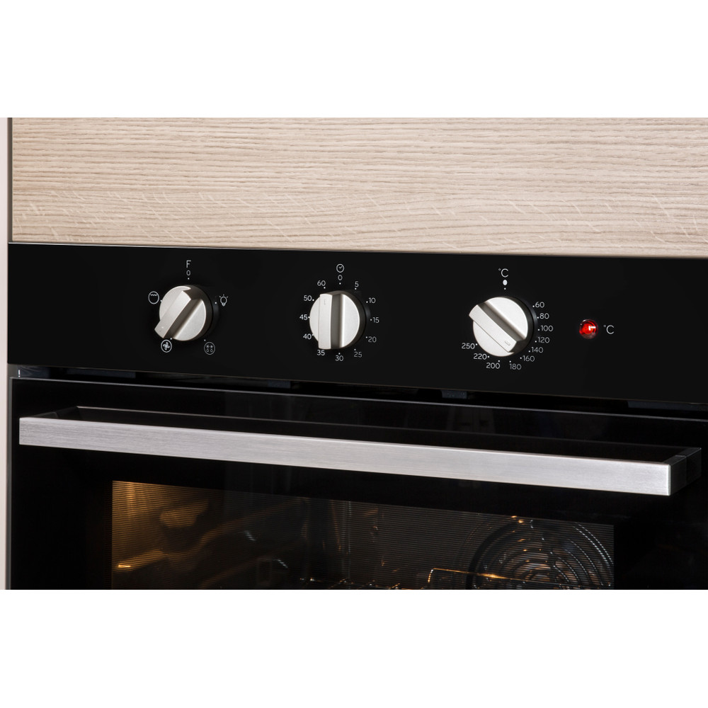 The Indesit Aria IFW 6330 BL Oven in black helps you make delicious meals while the easy cleaning solutions gives you more time to spend with your family. Featuring our exclusive Click&Clean system, easily remove the oven door in just two steps for quick, hassle-free cleaning. Complemented by the clever Tilting Grill which pulls out and downwards to give you better access to the top of the oven cavity, it’s an easier way to tackle food and fat spits. With 66L of capacity, fan power helps to cook all your favourite family meals, while the Full Surface Grill provides 95% coverage of the oven roof for an all-round heat, plus uniformed browning with no burnt edges or uncooked areas. Plugging into the mains socket makes this sleek, yet practical model easy to install into your kitchen, guaranteeing easy eating and even easier maintenance.